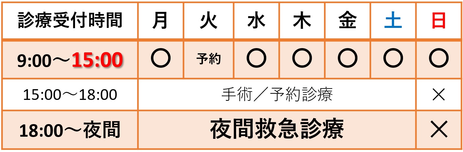 ※15:00~18:00の間も「予約(当日OK)」にて外来を行っております。手術内容によって対応時間が変わる為、来院前にお電話を頂き、指定したお時間にご来院下さい。