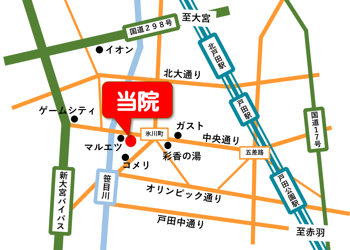 周辺地図 ゆい動物病院〒335-0027 埼玉県戸田市氷川町2-16-22TEL.048-299-7307 アクセス 自動車での来院 五差路(東方面)からご来院される場合五差路から新大宮バイパス通り方面に進みます。道沿いに真っ直ぐ進み、「彩香の湯」と「城北信用金庫:戸田支店」を通り過ぎ、マルエツ戸田氷川町店の隣にあります。高速道路からご来院される場合上り戸田IC・下り戸田南ICから2km:下笹目交差点を東へ曲がり、右手に見えてきます。 駐車場:4-5台