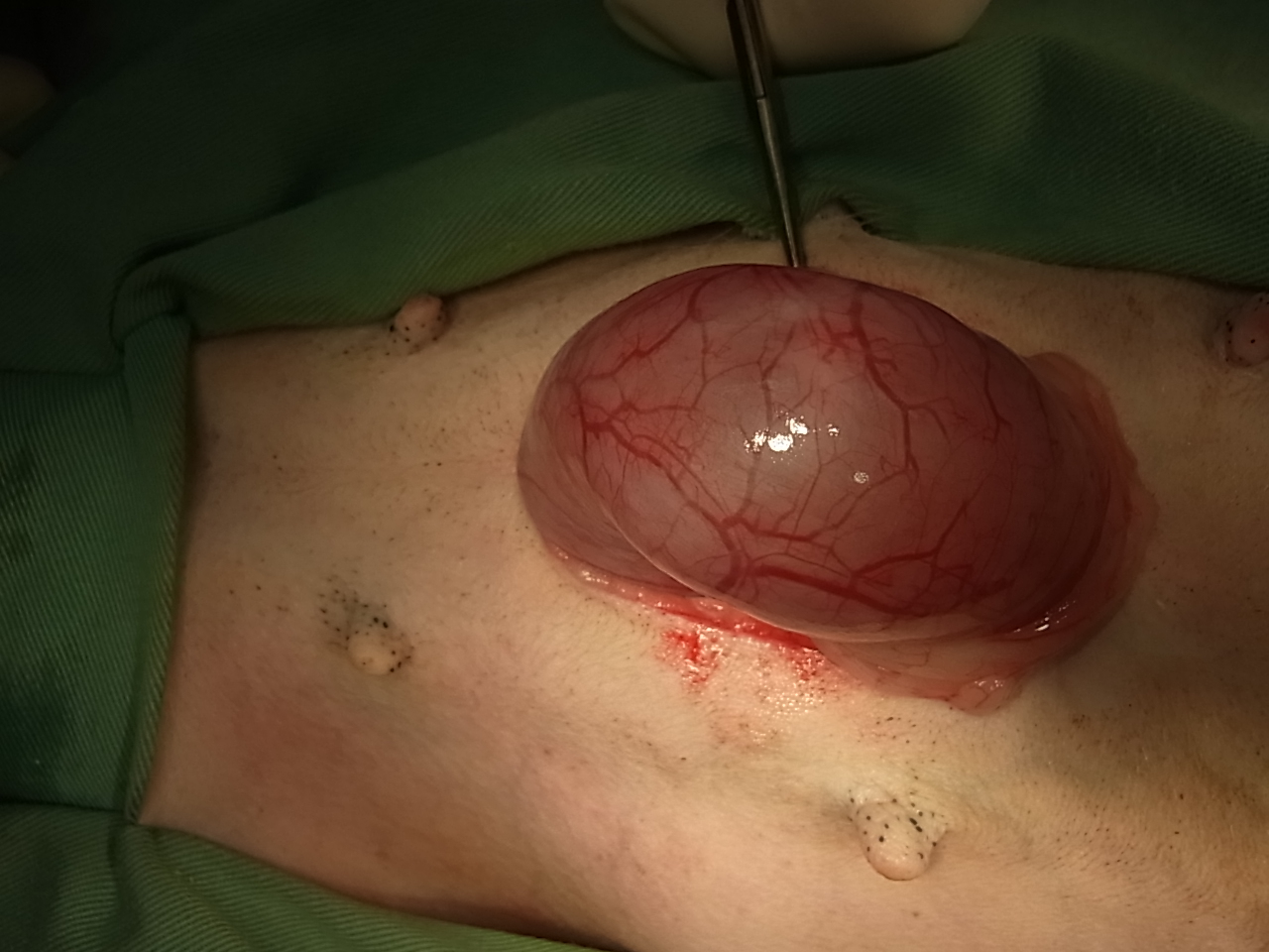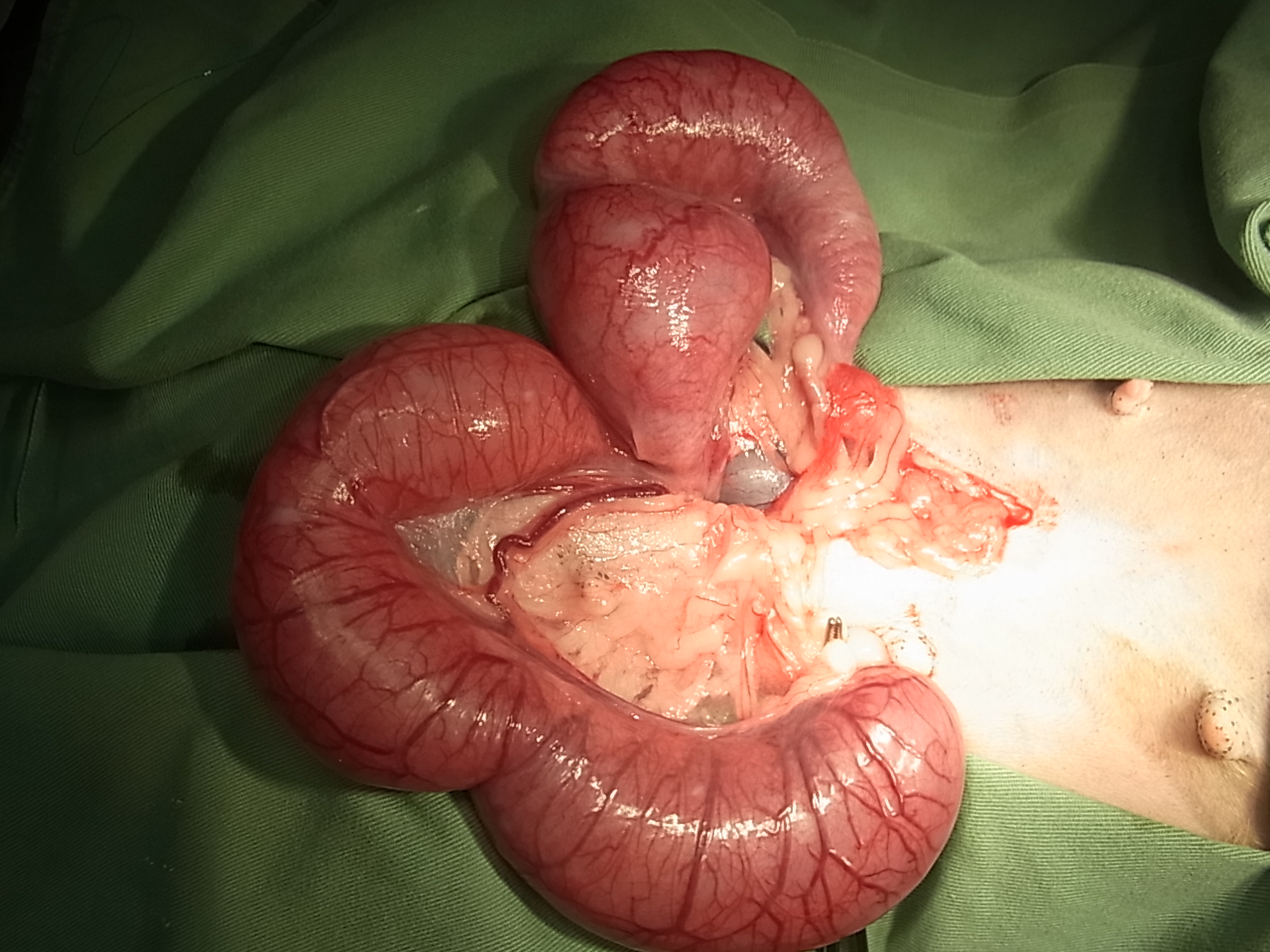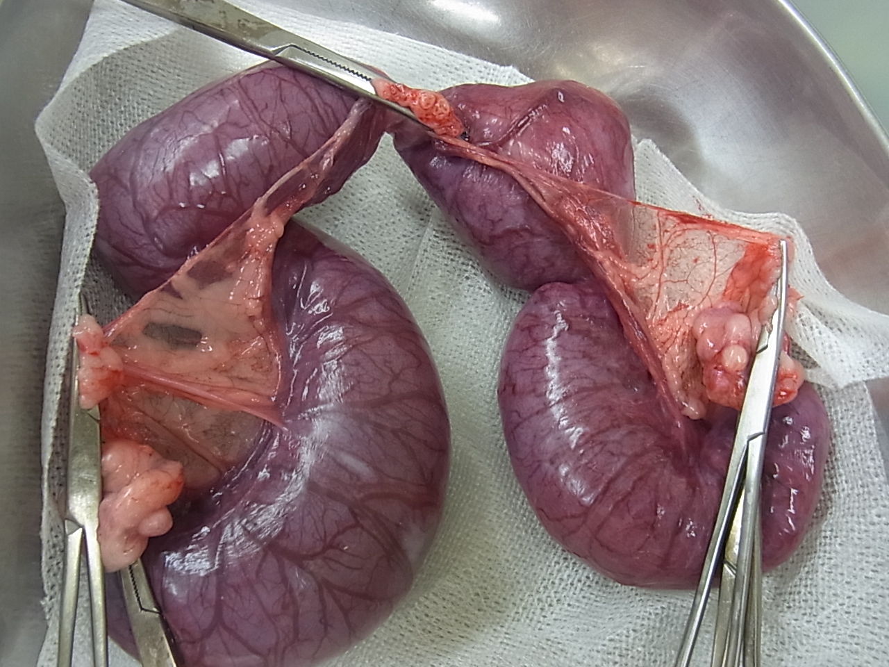 犬の子宮蓄膿症 最近元気がなく、食欲も落ちてきたとの事で来院しました。 陰部からは血膿が出てくる様子がありました。 血液検査では炎症反応が観察され、レントゲン検査および超音波検査にて子宮の拡大像を認めました。 オーナーに同意のうえ卵巣子宮摘出手術を実施しました。 ↑術野の確保 ↑腹部の切開し膨らんだ子宮が観察された ↑子宮の全貌 ↑子宮摘出後 ↑手術終了 ↑摘出された子宮 ↑子宮を切開すると中から膿が多量に出てきた