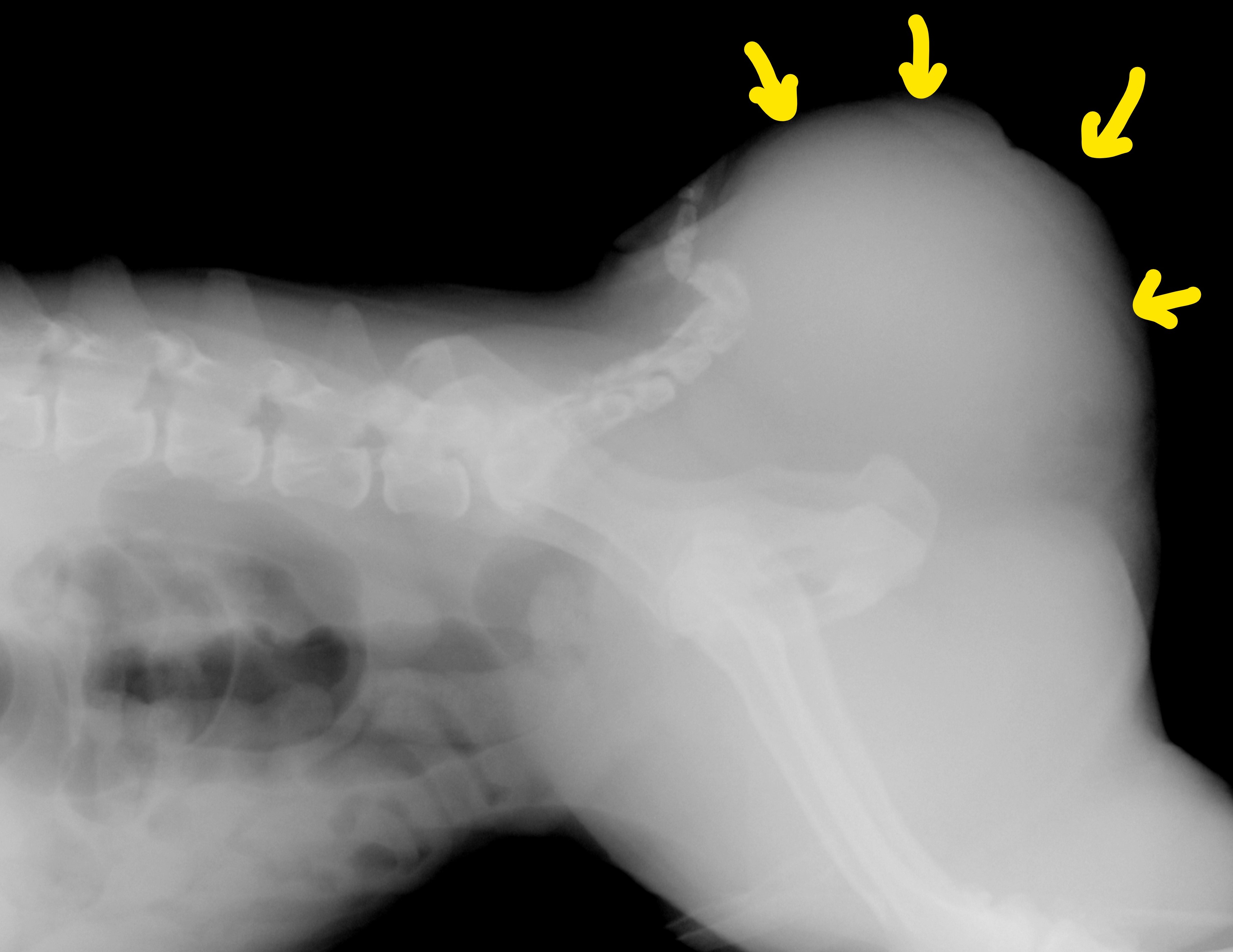 レントゲン画像:会陰部(矢印)が重度に膨らんでいる