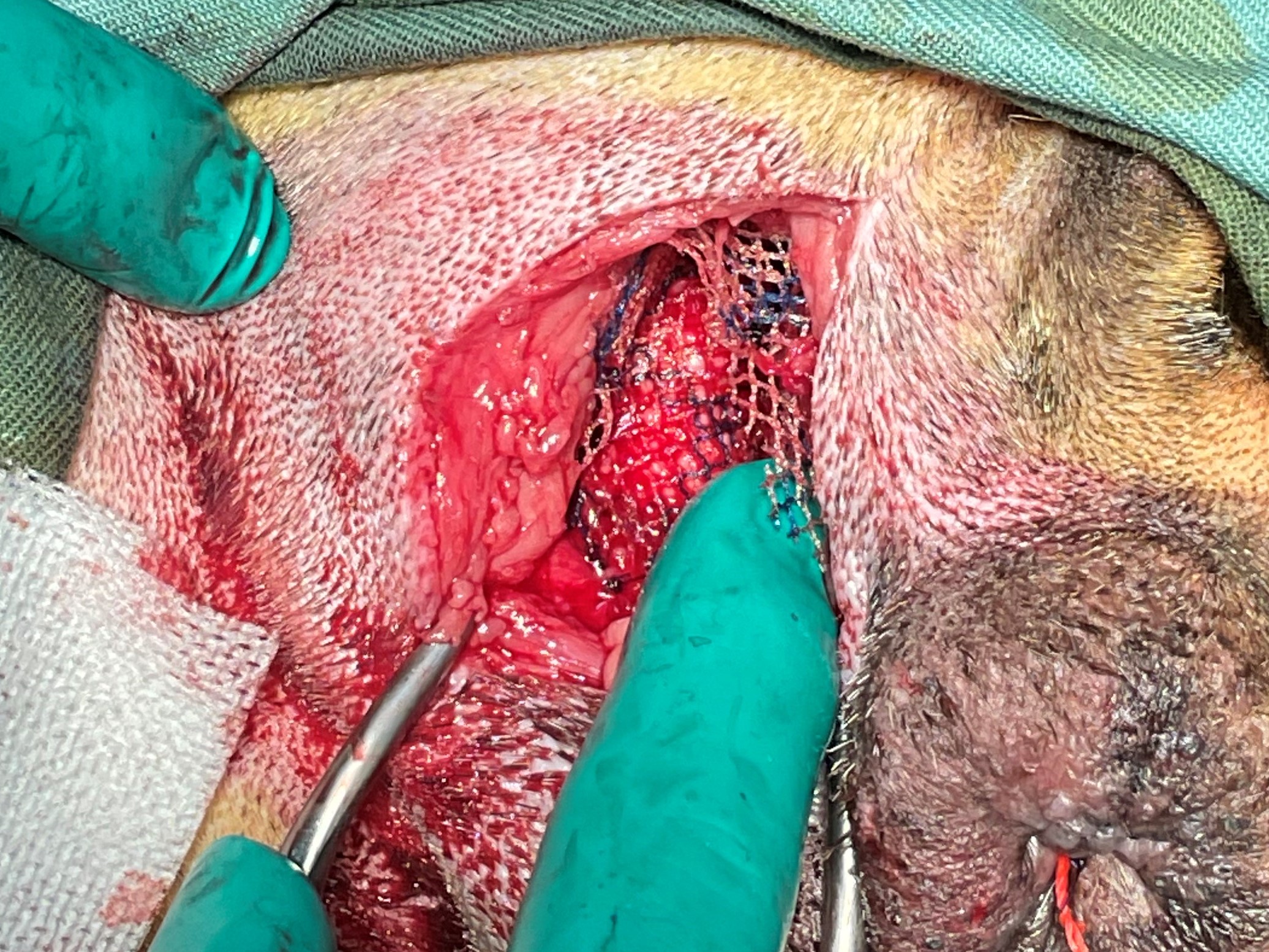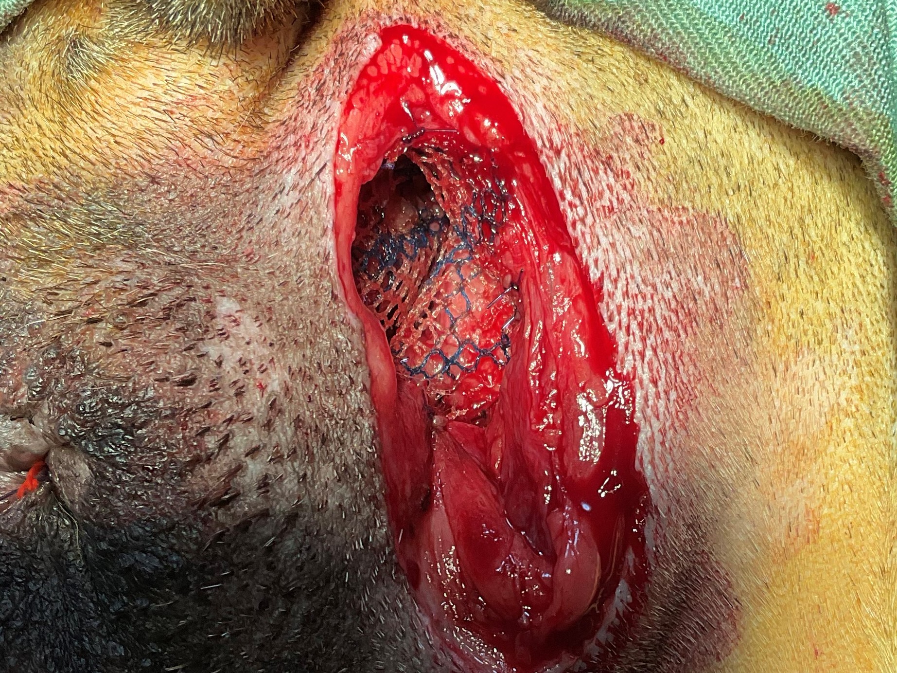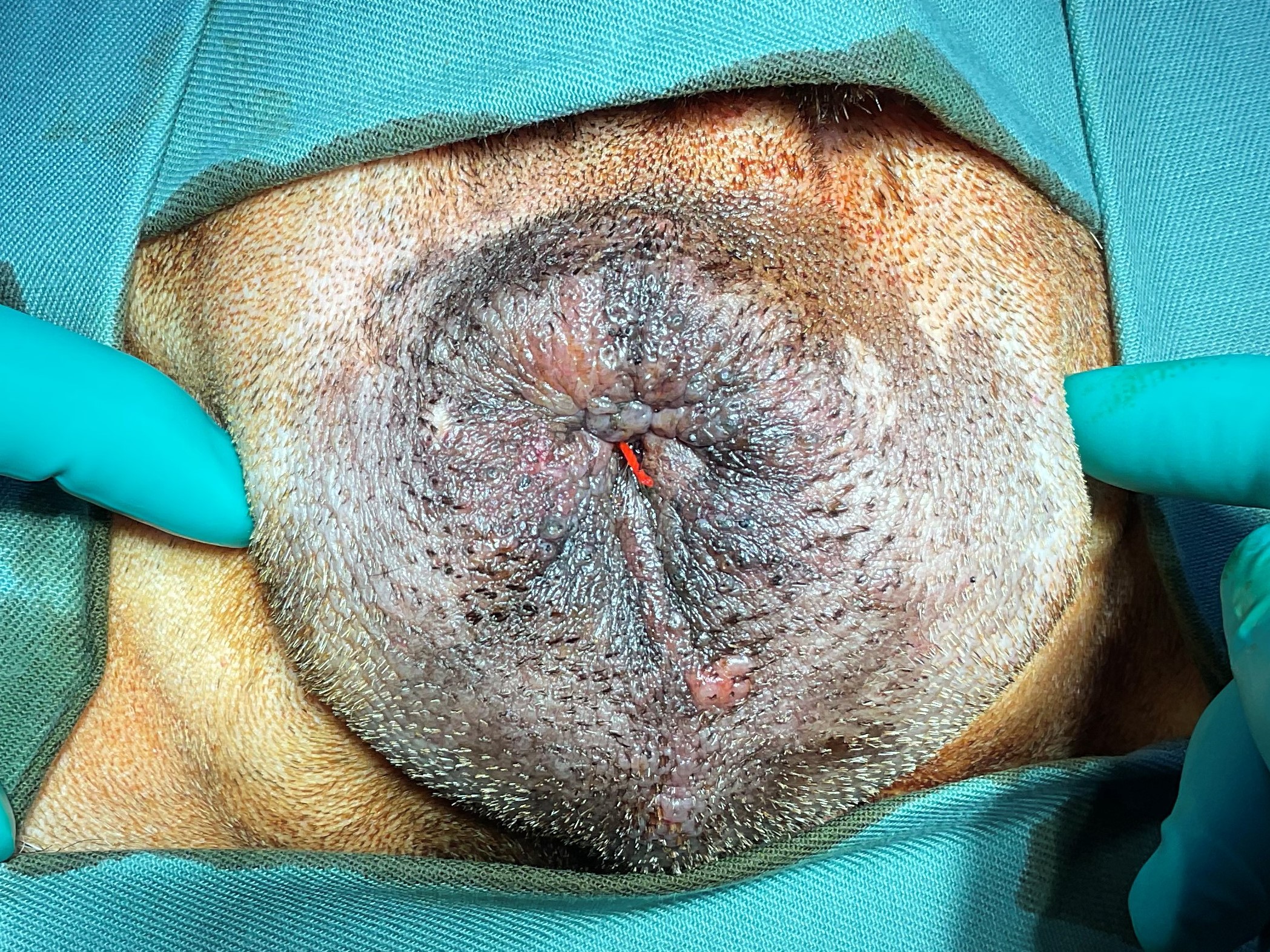 会陰ヘルニアの手術を開始:肛門の左右に拡張したヘルニアが観察される