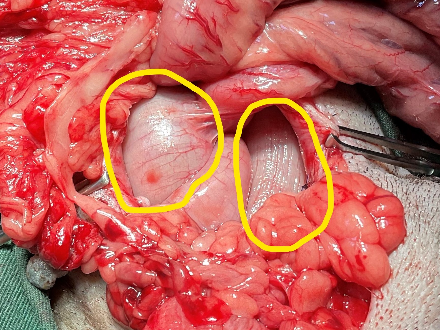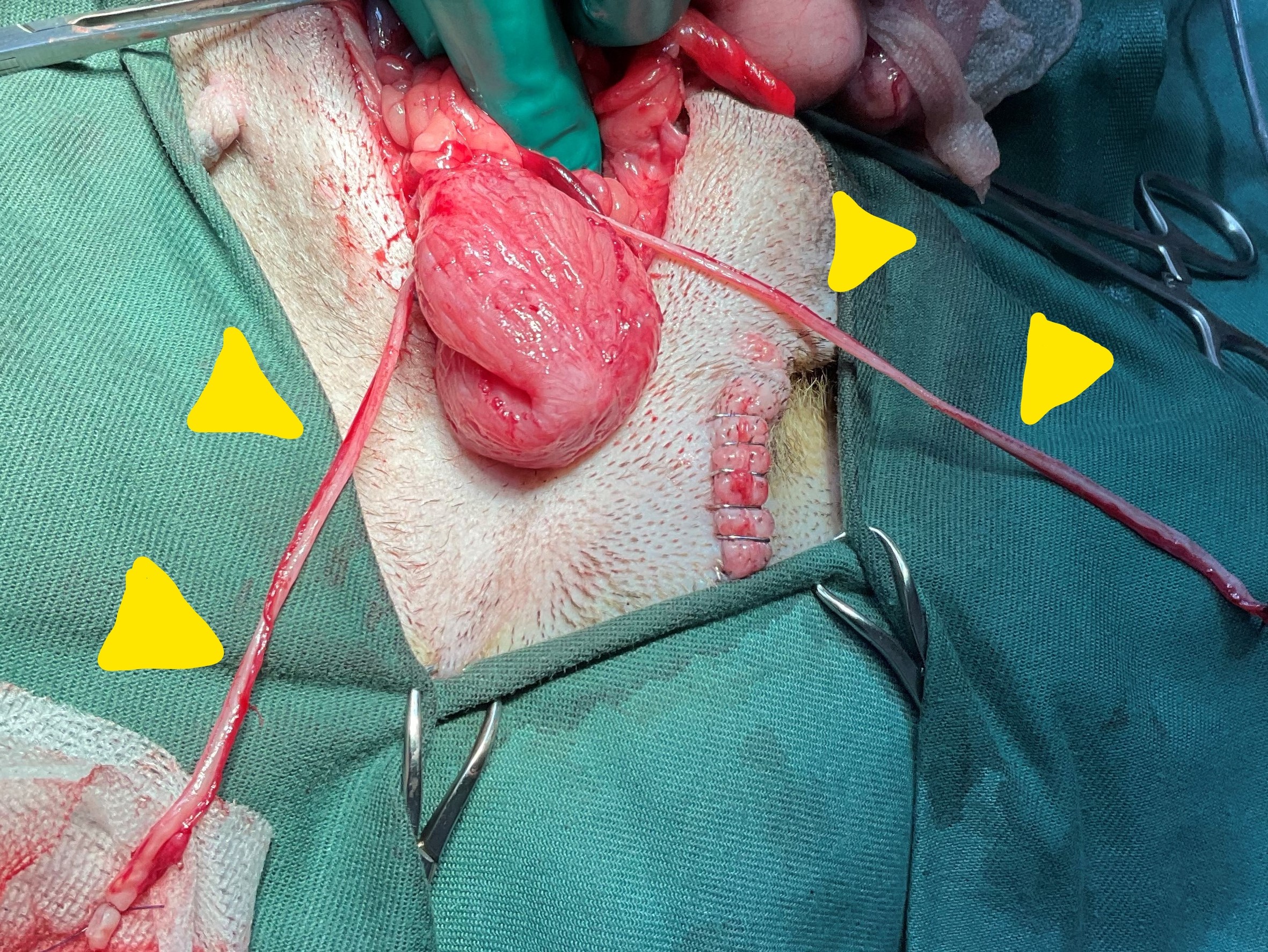去勢時に精管を分離・温存し、お腹側から膀胱を引っ張り出し、精管(矢頭)を腹壁に固定して膀胱の再嵌頓を予防
