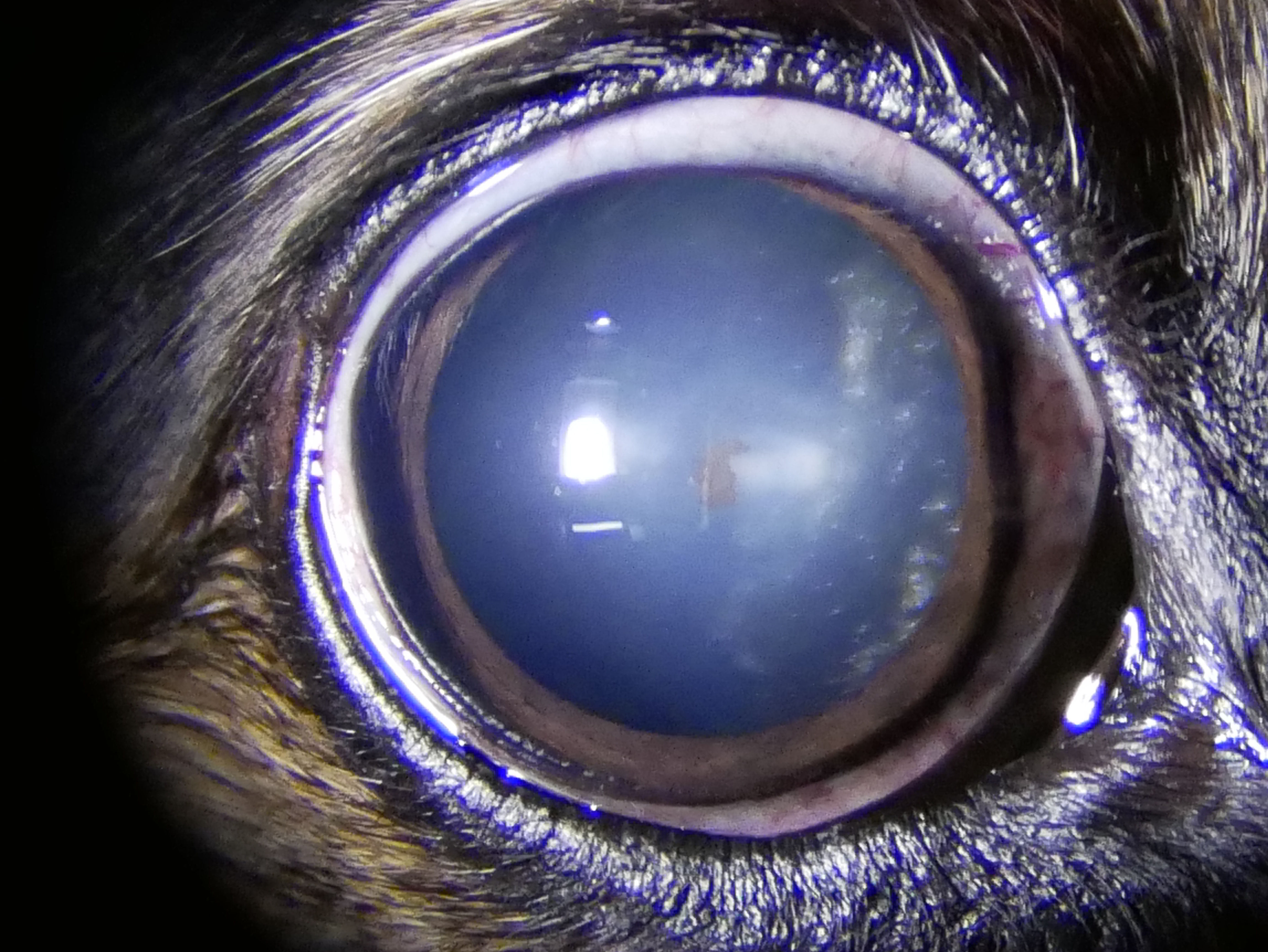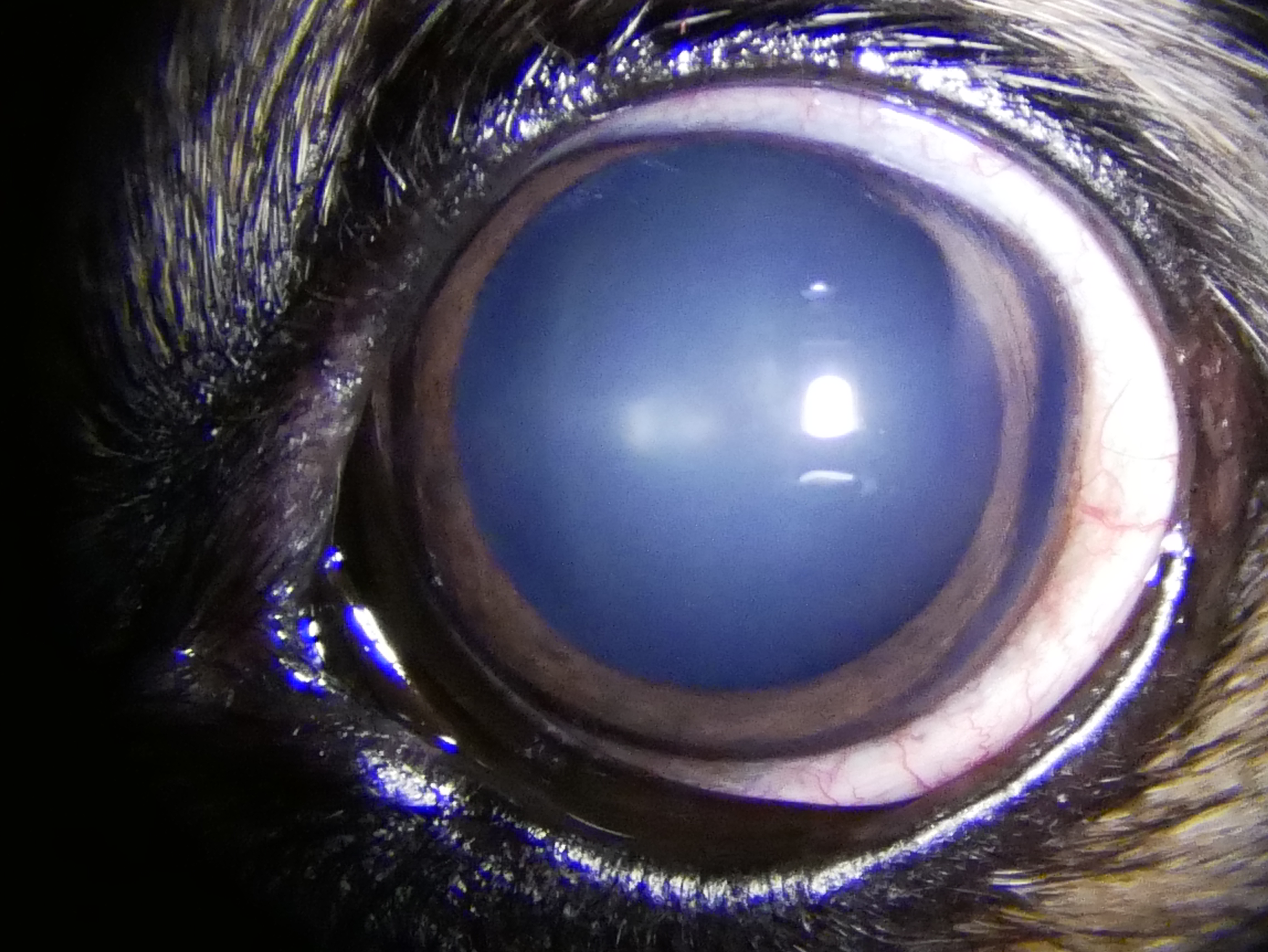 両眼共に瞳が大きく(散瞳傾向)が観察され、視覚の評価では明るい所での歩行検査で異常はみられなかったものの、暗所での歩行時には障害物や壁にぶつかりながら歩く様子がみられました。