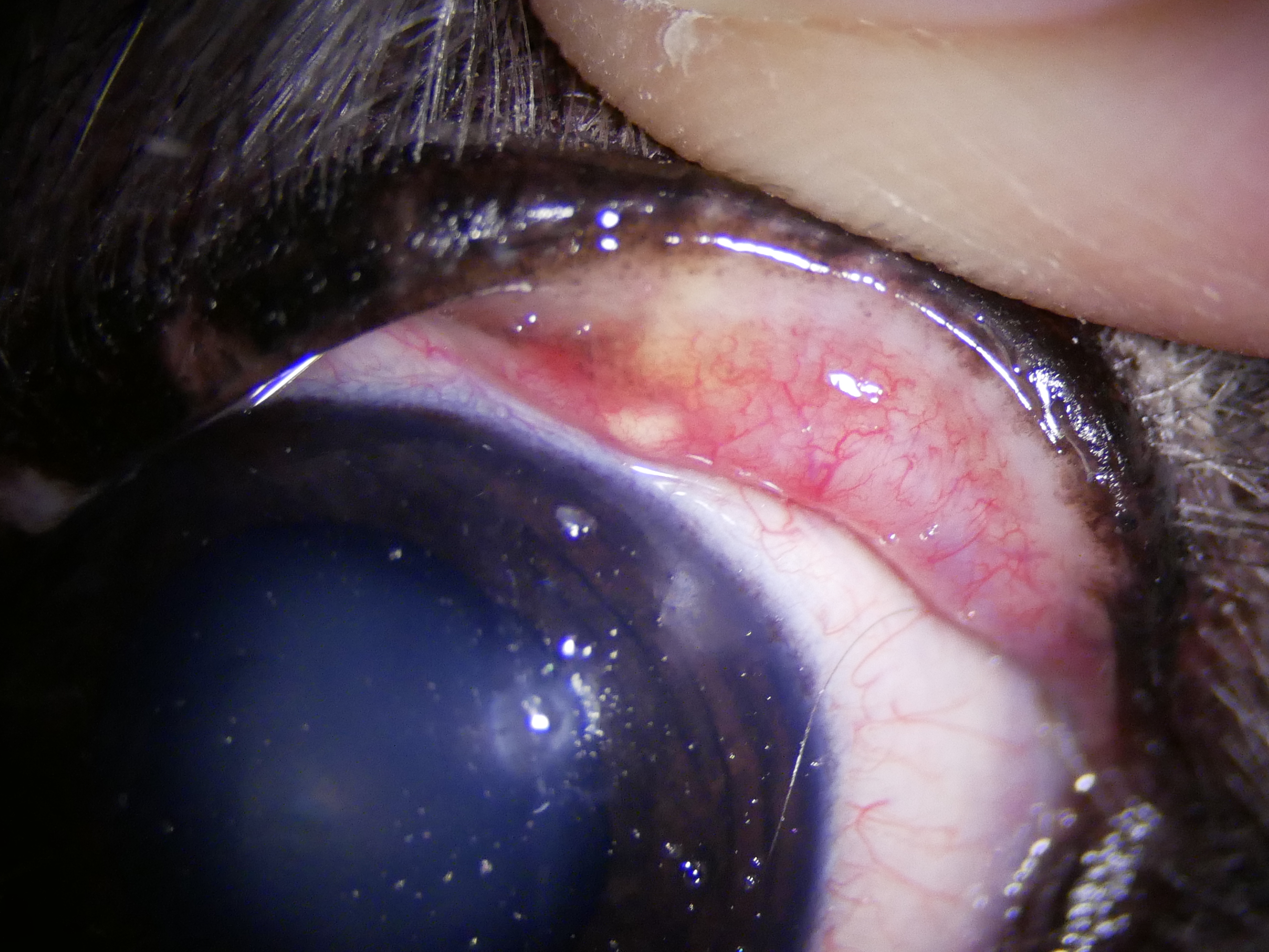 左眼の上眼瞼に腫脹がみられ、眼瞼裏には白色隆起病変(霰粒腫)が観察されました。
