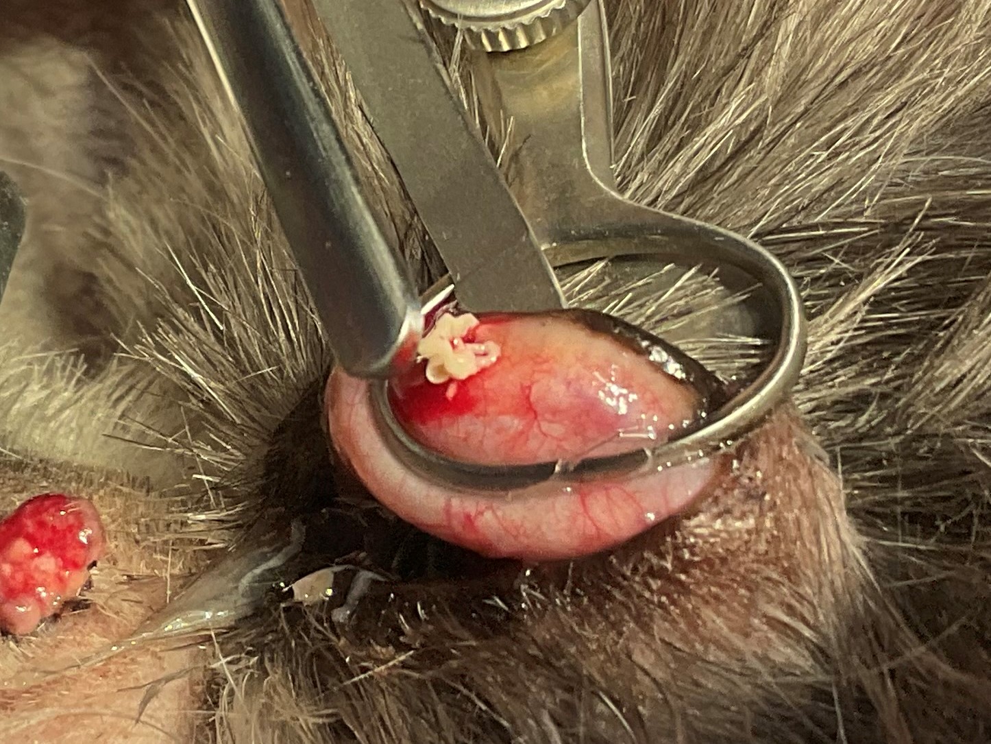 当院でも抗炎症治療や抗生剤の治療を行いましたが、すぐに再発してしまう為、鎮静下で霰粒腫の圧出処置を実施しました。
