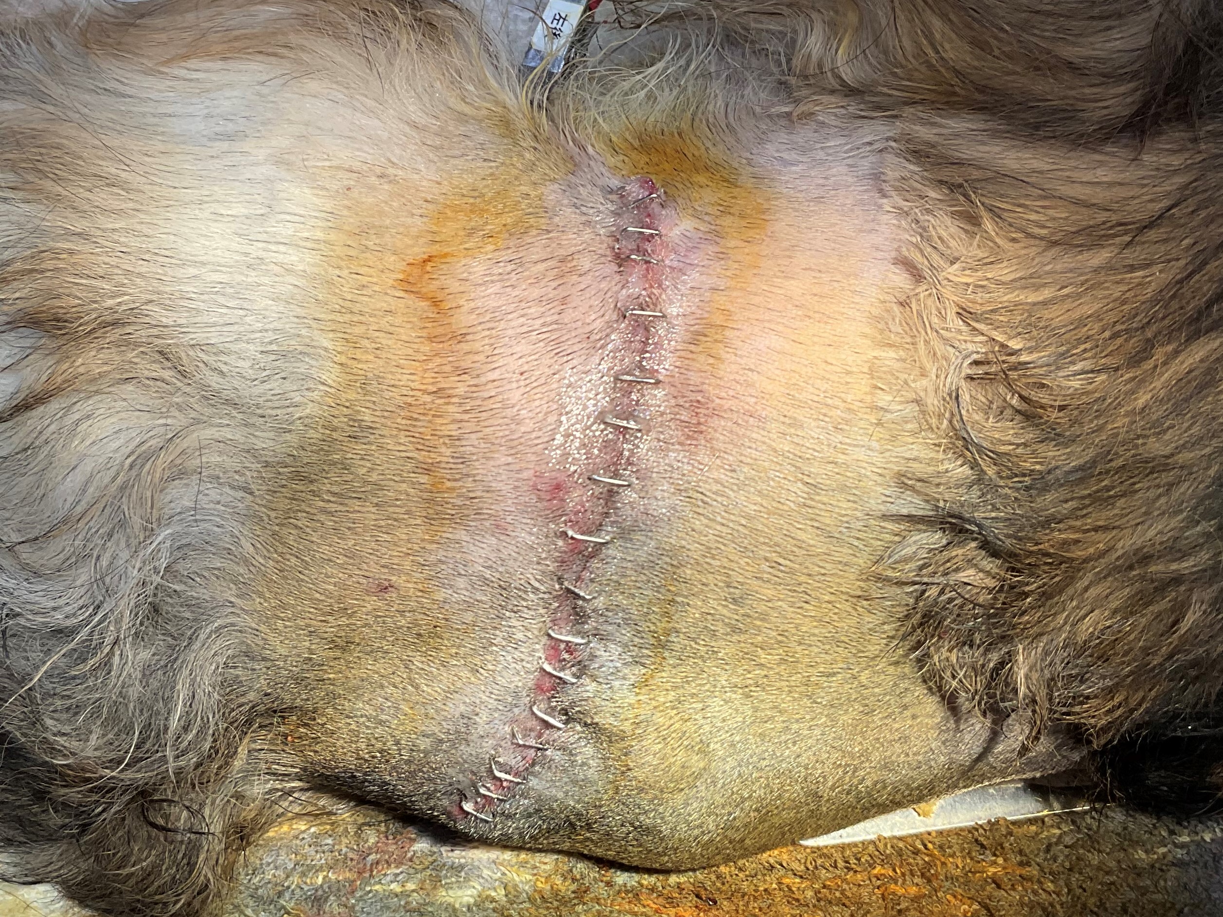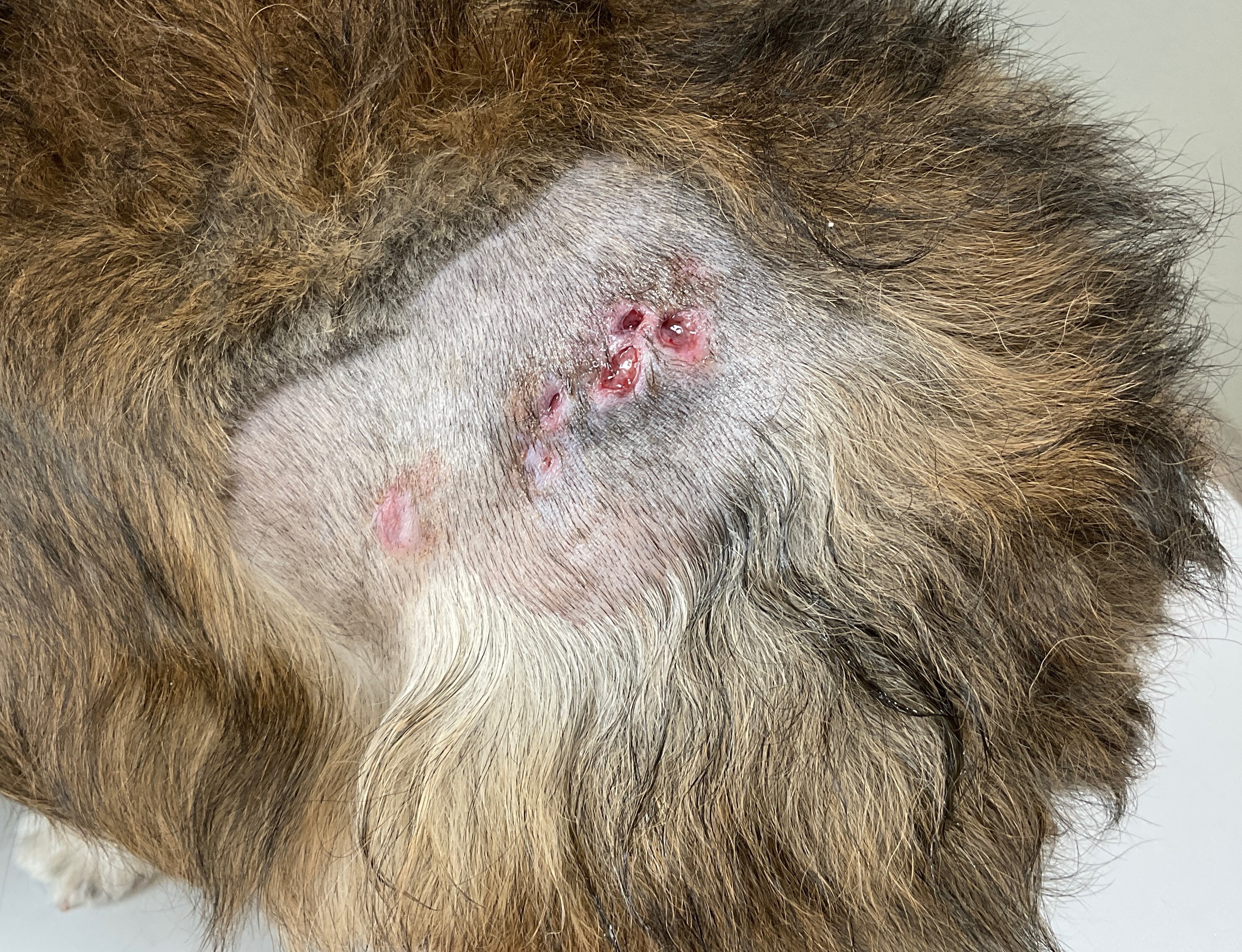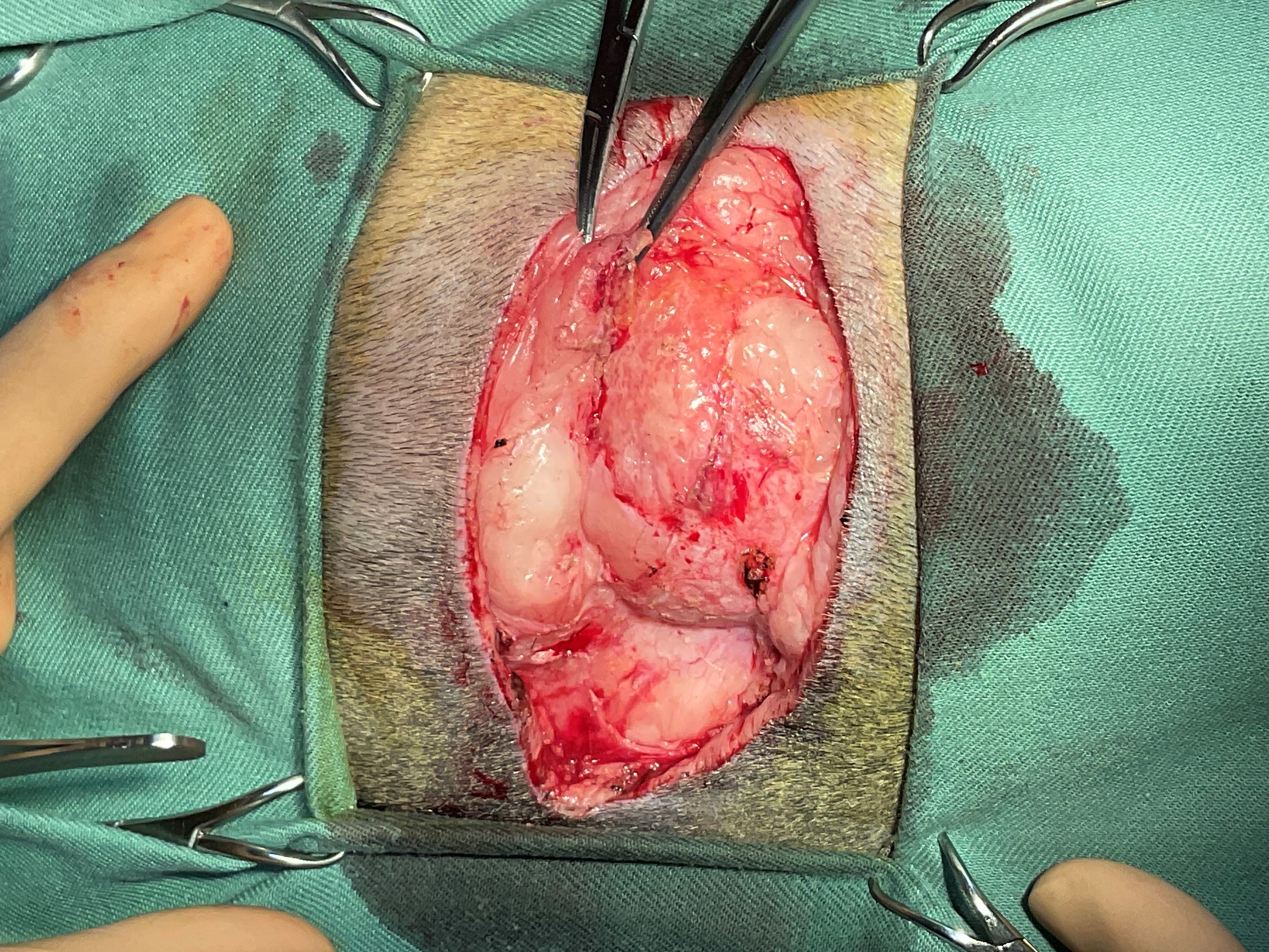 当院にてまずは感染症に伴うものを疑い、細菌培養検査による菌の同定を行いましたが、検出されませんでした。抗生剤治療中も潰瘍部は不安定で、他の部分に皮下腫瘤も出来始めた為、病変部の切除および病理検査を実施しました。