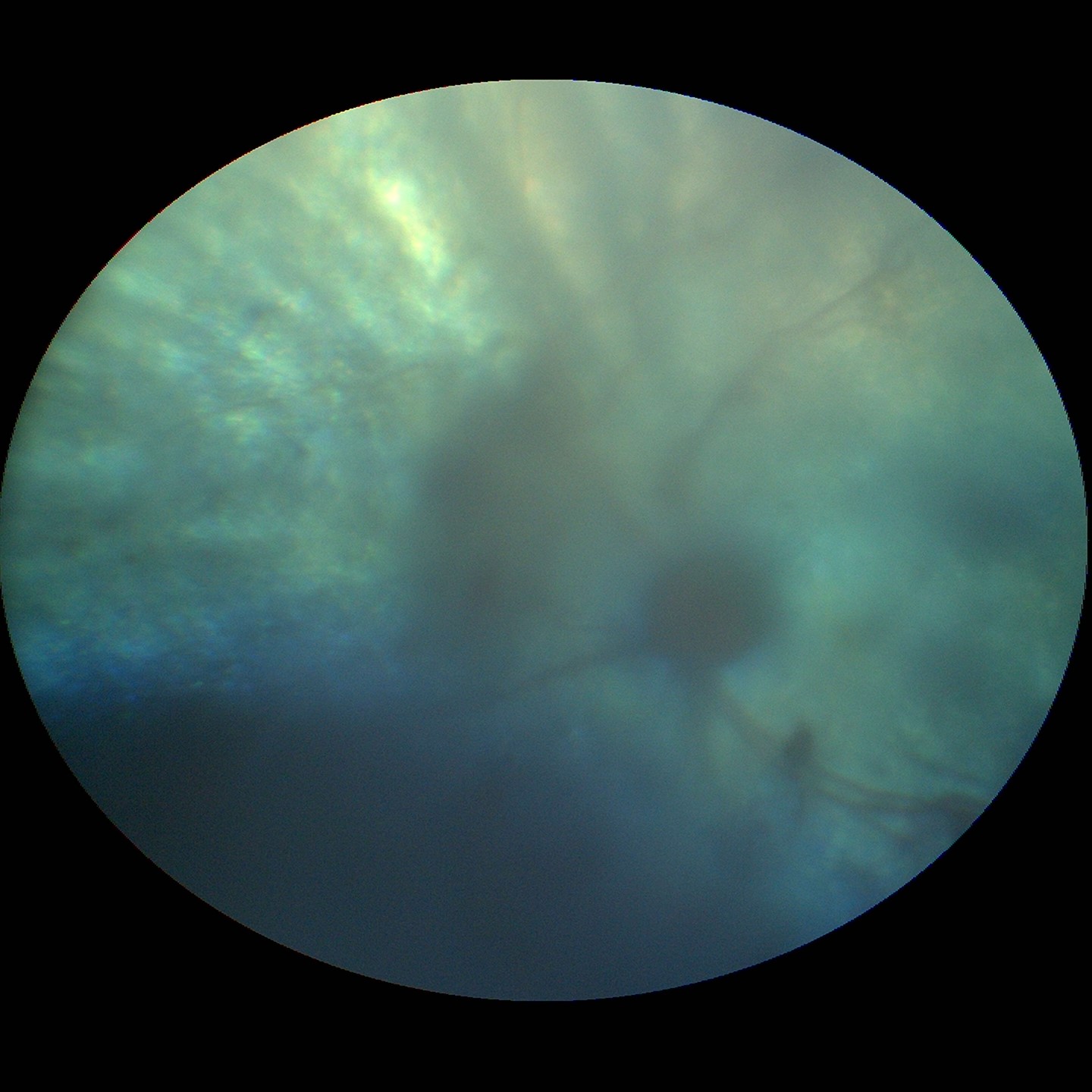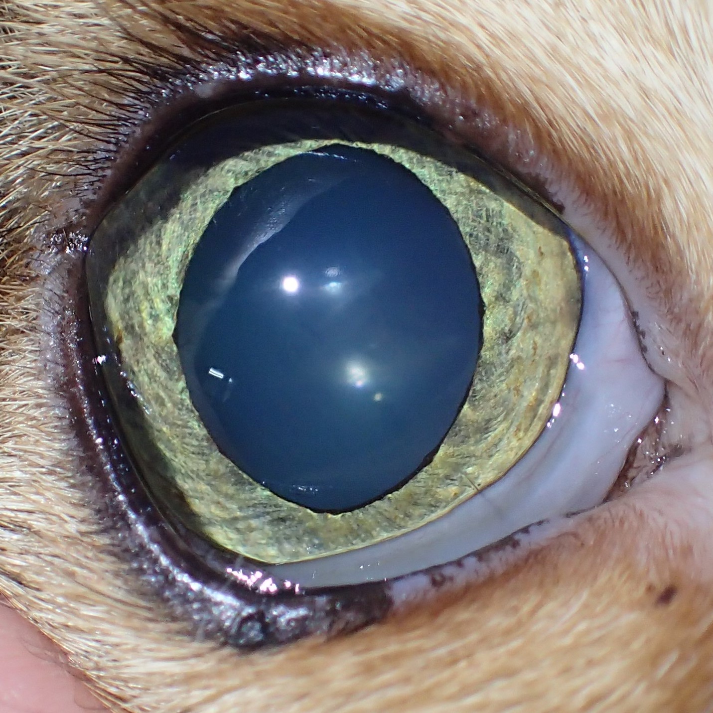 両眼とも視覚はみられ、虹彩萎縮(虹彩の加齢性変化)があったものの、瞳孔の動きに異常は認めませんでした。眼圧も正常でした。