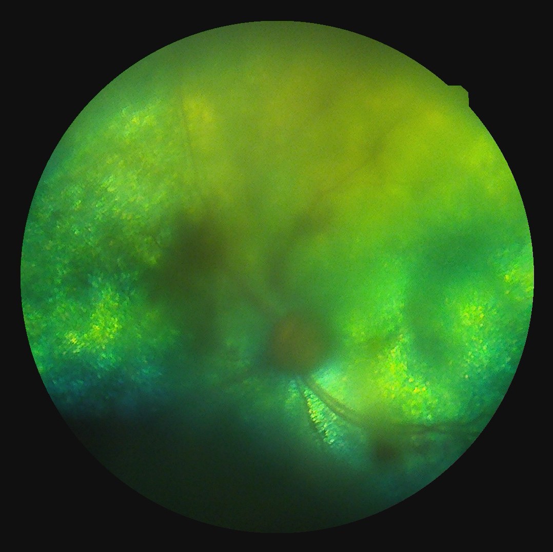 慢性腎臓病で治療中の猫が、眼の奥が赤く見えるとの主訴で紹介来院されました。